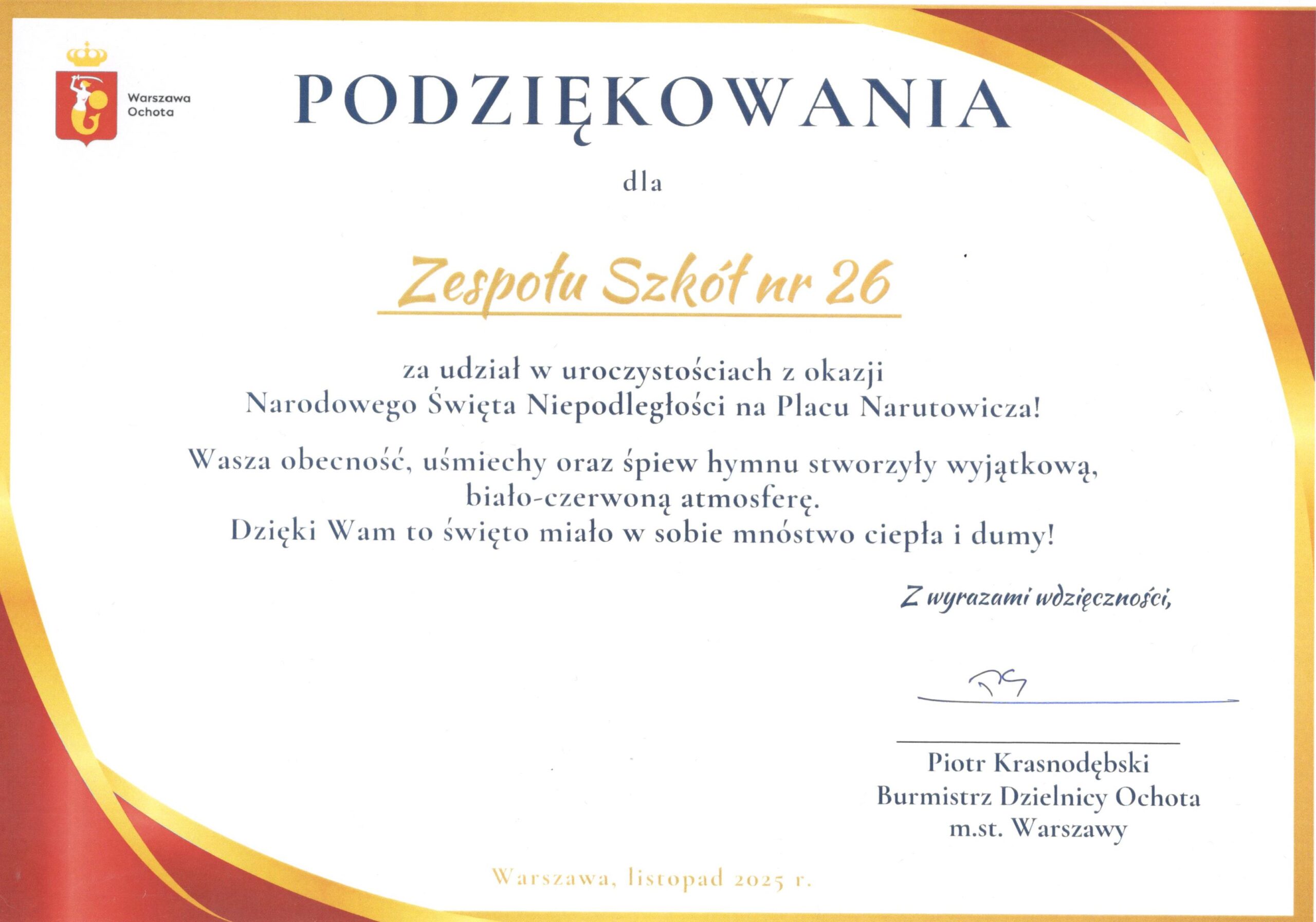 W piątek 07 listopada 2025 roku uczniowie klasy 3Ai wraz z wychowawczynią p. Renatą Deleżuch uczestniczyli w obchodach Dnia Niepodległości organizowanych przez Dzielnicę Ochota m.st. Warszawy.